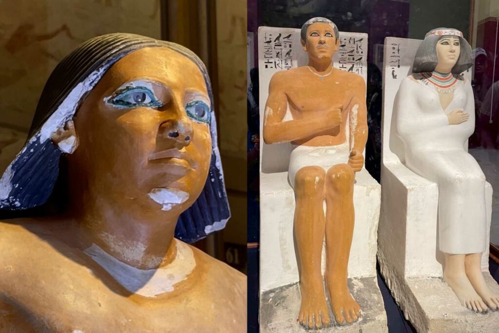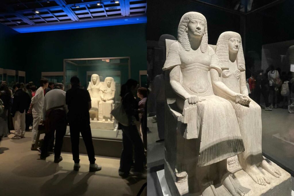 「夫妻像」在埃及墓穴中是十分常見的雕像形式。《埃及之王:法老》展出的雕像以原色石雕為主,但在埃及博物館可以看到大量栩栩如生的彩色雕像。古埃及人會以極為寫實的鑲嵌工藝製作眼睛,在眼白用石灰石、石膏,高級一點就用象牙製作,讓色調有機而不死白;在虹膜和瞳孔的部位,則會使用水晶或玻璃等半寶石,瞳孔則以黑曜石或簡單的黑色樹脂畫龍點睛。博物館現場可見許多埃及當地人的面孔,他們同樣擁有一雙那麼有神、漂亮的大眼,古埃及人對雕像之講究已不言而喻。