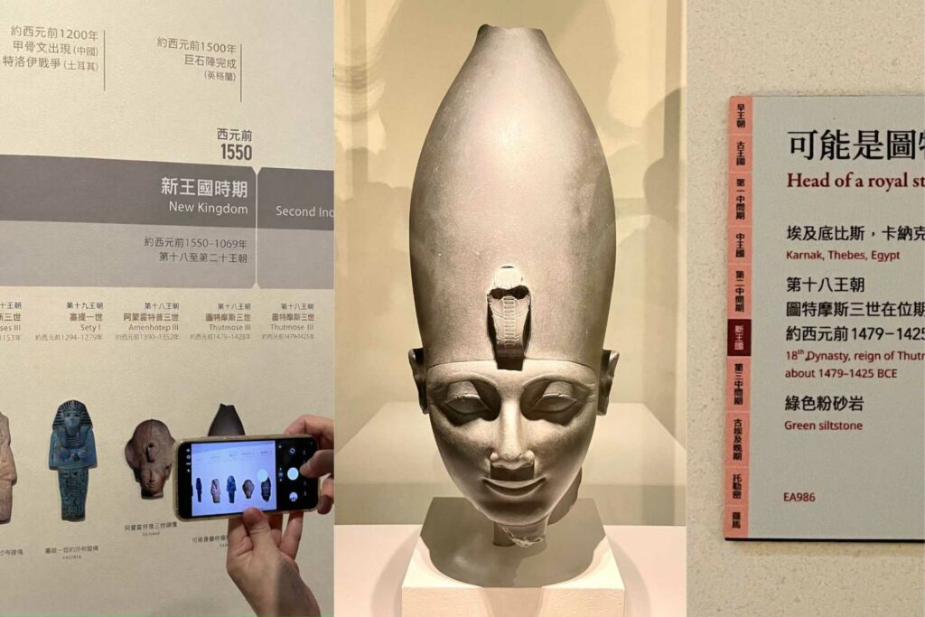 |《埃及之王:法老》展品資訊極為嚴謹,在入口展廳〈埃及:法老的國度〉放置文物出土的年代紀要,幫助觀眾初步認識文物,並在每個展品說明牌上清楚標示年代及來歷。該肖像為新王國時期的法老頭像,推測是圖特摩斯三世。
